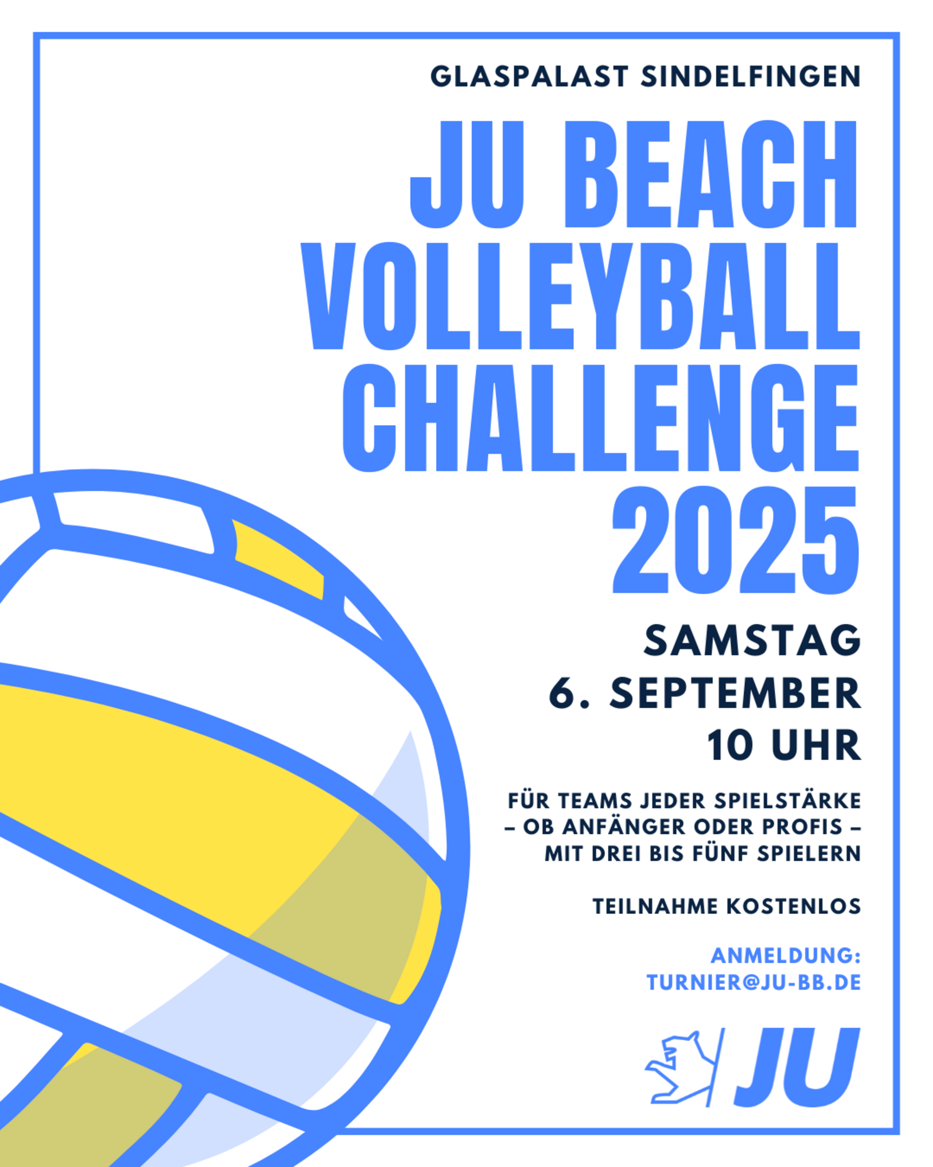 Die Junge Union lädt ein zur JU BEACHVOLLEYBALL CHALLENGE 2025 am Samstag, den 6. September 2025, ab 10 Uhr auf den Beachvolleyballfeldern am Glaspalast Sindelfingen (Rudolf-Harbig-Str. 10, 71063 Sindelfingen). Teilnehmen können Teams jeder Spielstärke – ob Anfänger oder Profis – mit drei bis fünf Spielern. Die Teilnahme ist kostenlos. Auf die Teilnehmer warten neben spannenden Spielen und kühlen Getränken auch gute Musik sowie vielfältige Preis für die erfolgreichsten Mannschaften.