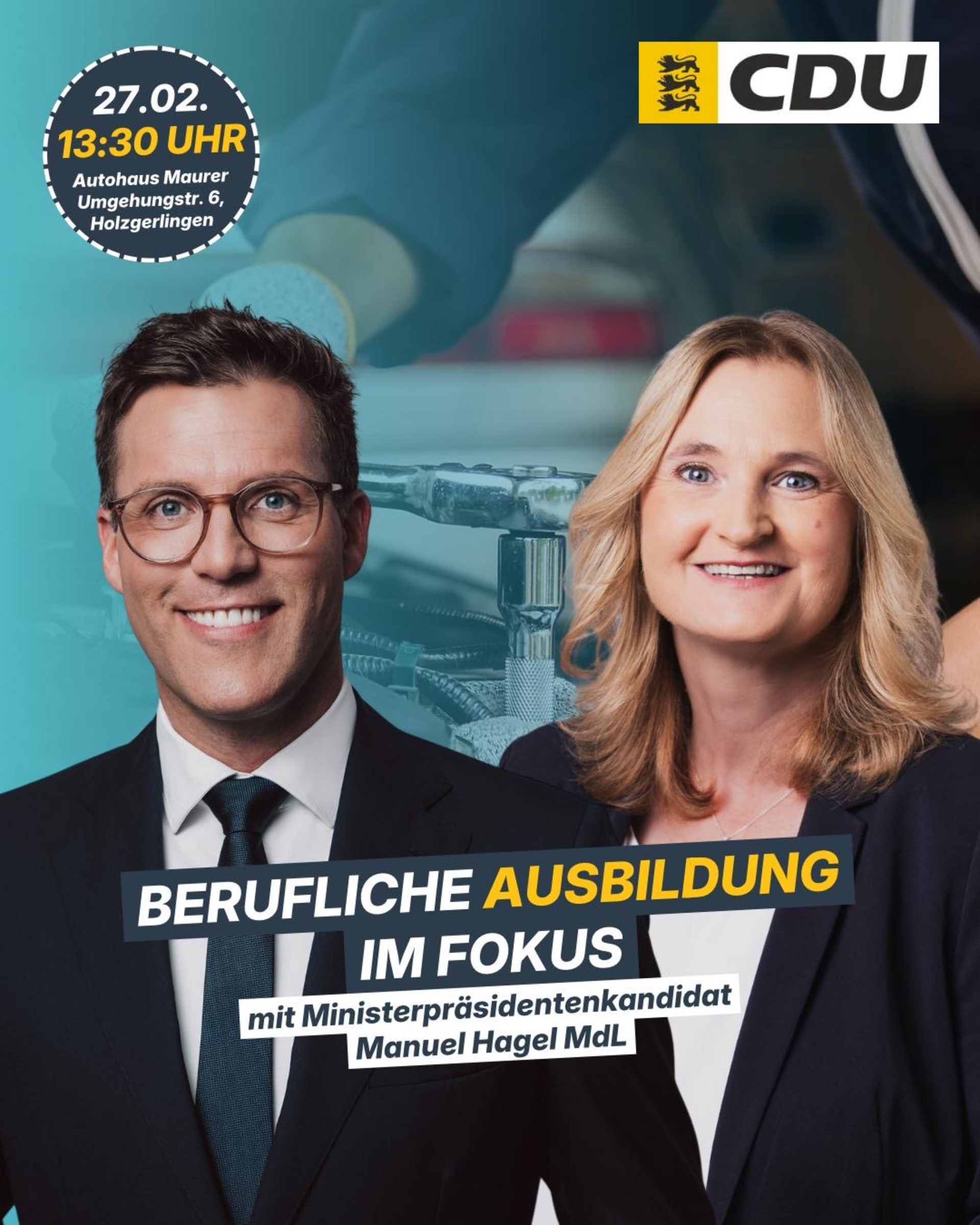 Manuel Hagel, Kandidat der CDU um das Amt des Ministerpräsidenten, kommt auf Einladung der CDU-Landtagskandidatin Regina Dvořák-Vučetić am 27. Februar 2026 nach Holzgerlingen. Er spricht um 13:30 Uhr im Autohaus Maurer (Umgehungsstraße 6, 71088 Holzgerlingen). Die Öffentlichkeit ist herzlich eingeladen.